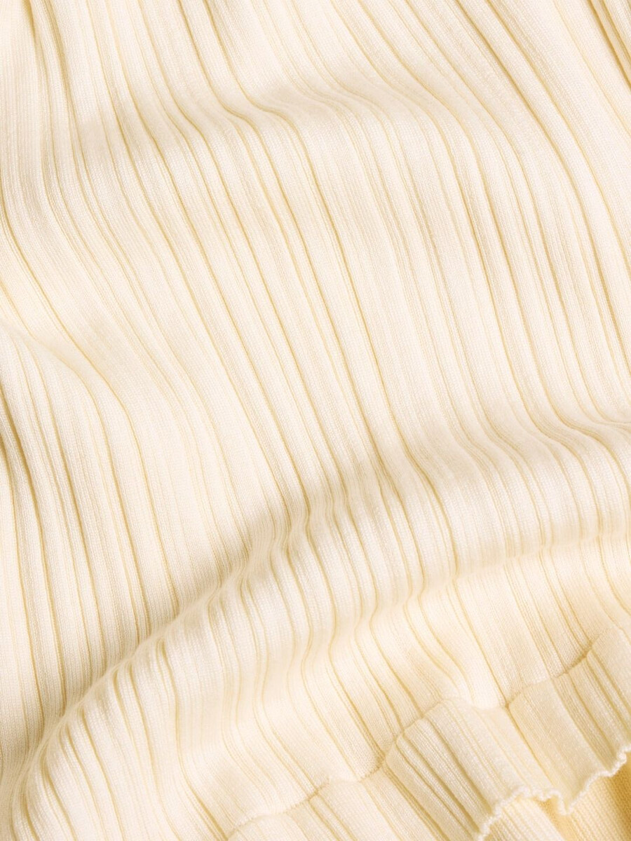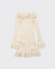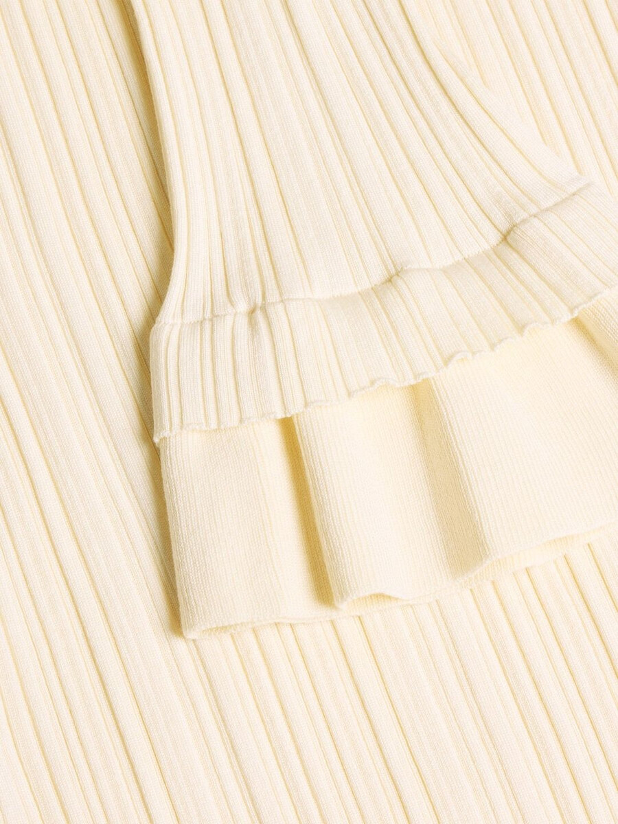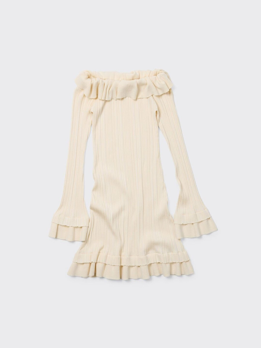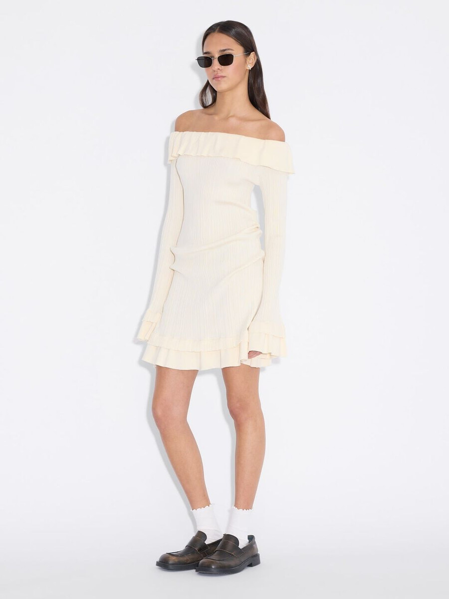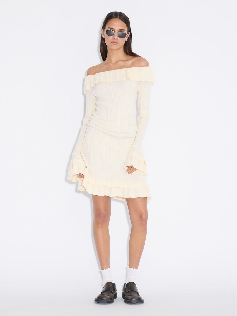 Realizzato in maglia elasticizzata a coste, l’abito Ripple ha una silhouette a spalle scoperte. È un modello a strati con orlo doppio e maniche lunghe.