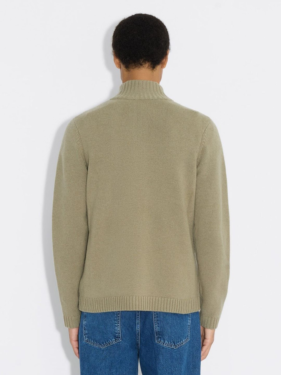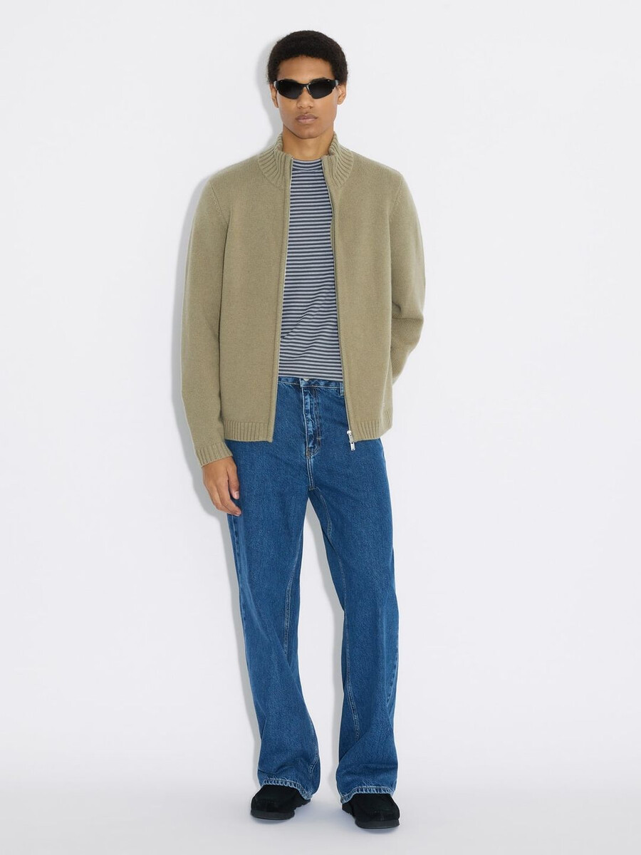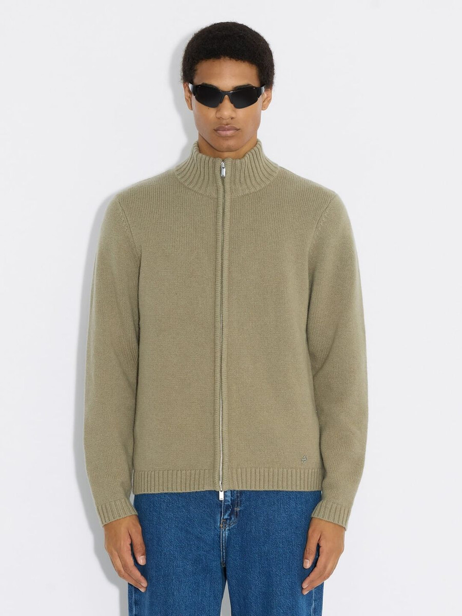 Ispirato alla natura, perfetto per ogni situazione, il cardigan in lana con zip presenta un’esclusiva tonalità salvia terrosa. Questo cardigan dalla vestibilità comoda presenta una zip frontale e offre due capi in uno: un capo comodo da indossare sopra i look di tutti i giorni o il punto focale di un outfit. Realizzato in pura lana, promette la massima morbidezza e calore grazie alla scollatura alta.