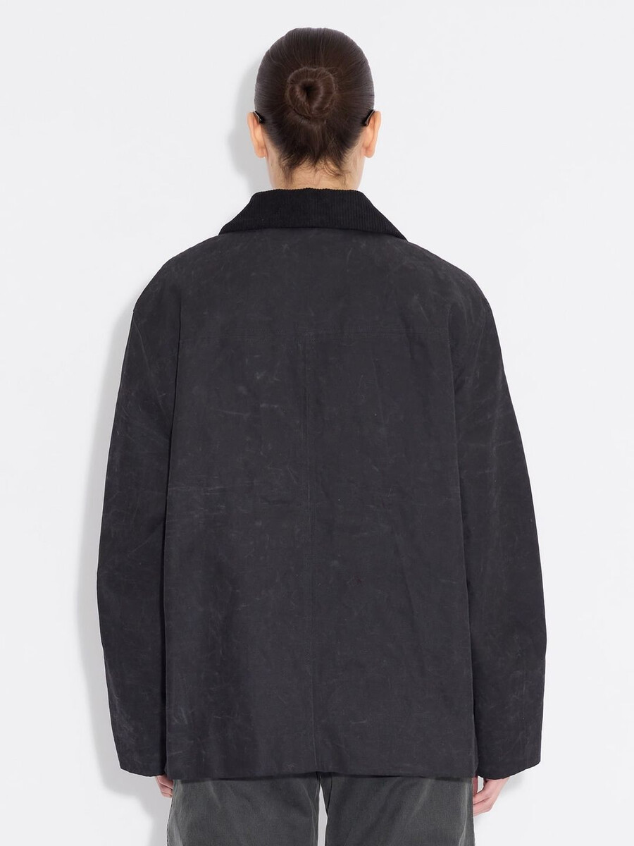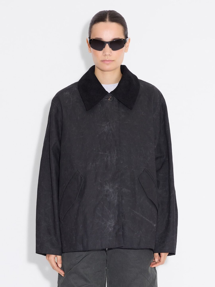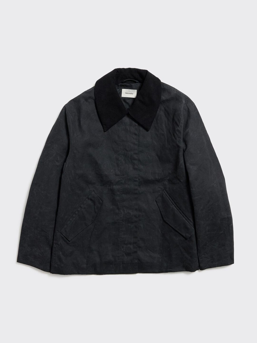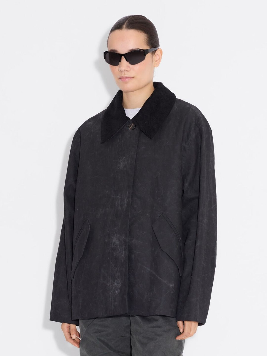 La nostra giacca corta Diana è realizzata in un tessuto resistente con finitura cerata che garantisce l’impermeabilità. Presenta un colletto in velluto a coste rimovibile, abbottonatura frontale nascosta e tasche laterali.